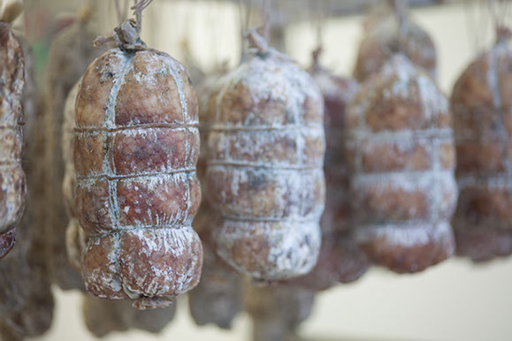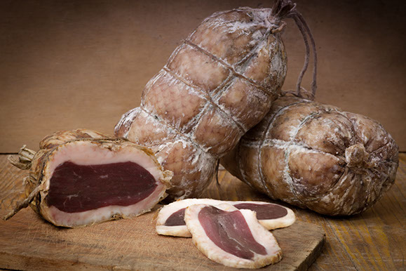 E’ una produzione artigianale del basso Friuli. La carne subisce una salatura, viene poi cosparsa con spezie ed arrotolata in modo che la pelle rimanga all’esterno. La particolarità di questo prodotto è l’insaccatura in un budello naturale che, dopo una leggera affumicatura a freddo con erbe aromatiche, mantiene morbide le carni ed al palato un gusto delicato. Dopo una stagionatura